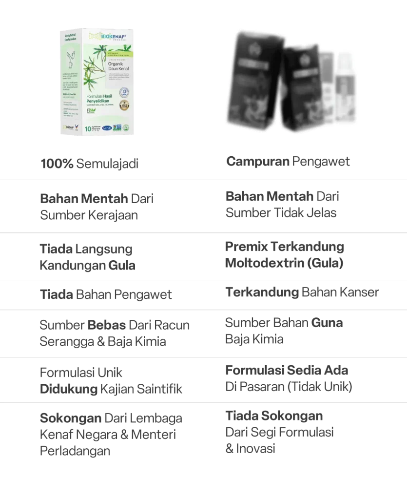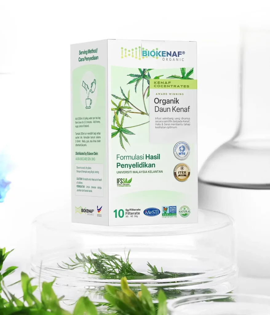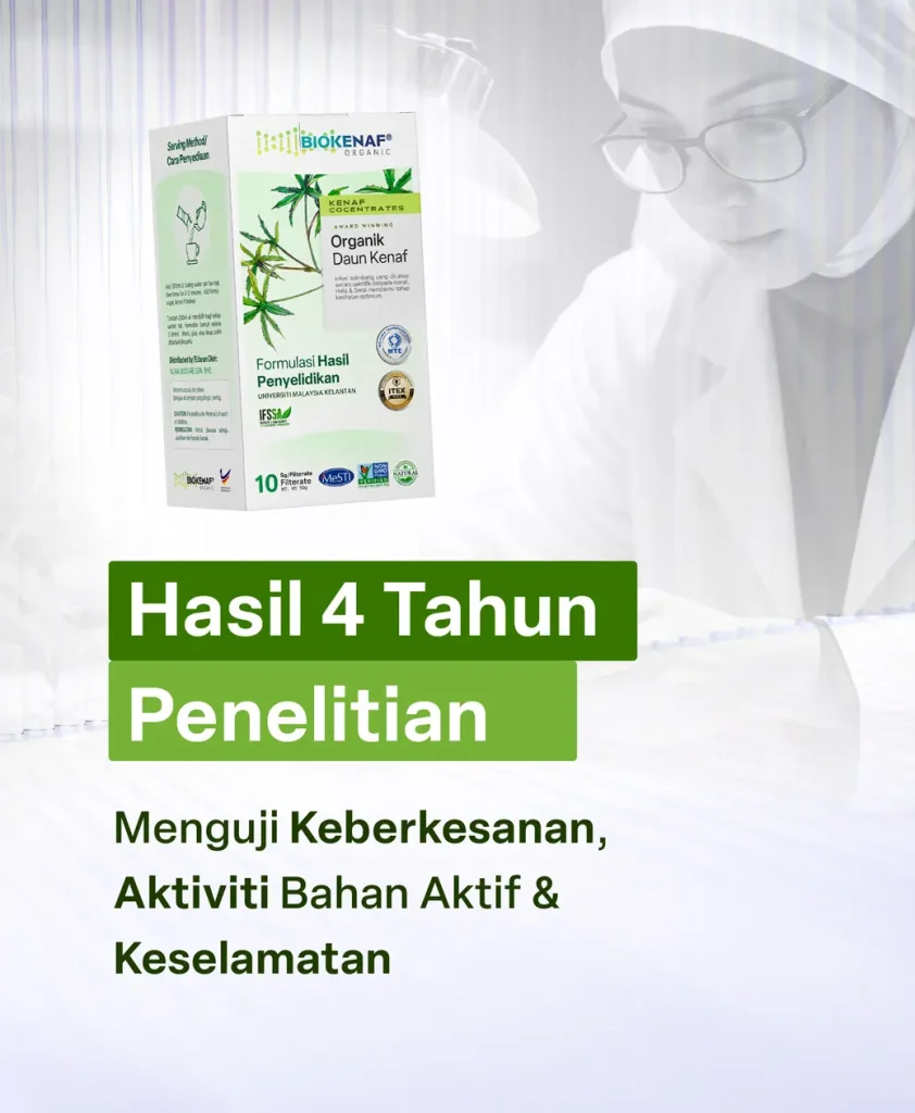 Biokenaf® diformulasi dari bahan semuljadi, 100% Organik tanpa bahan pengawet & telah menjalani ujian makmal ke atas sel hati memastikan keselamatan produk.