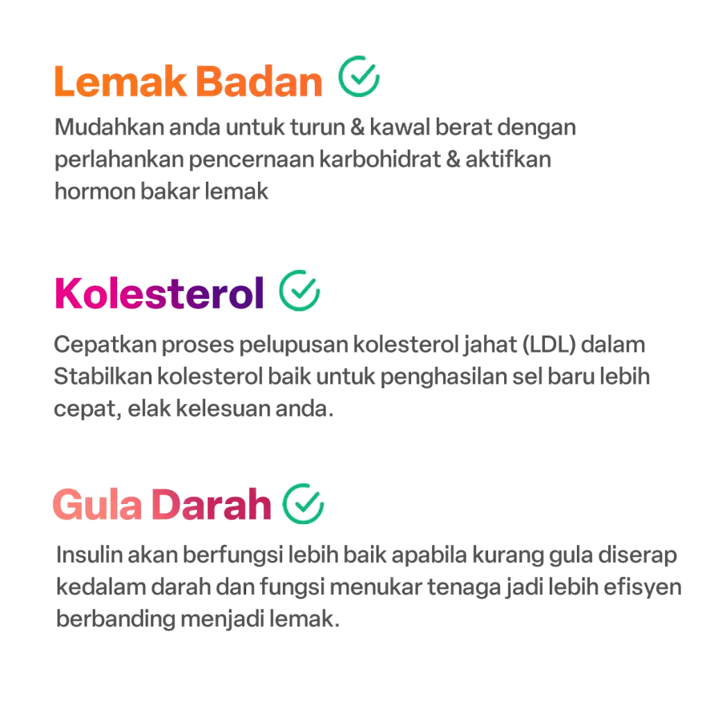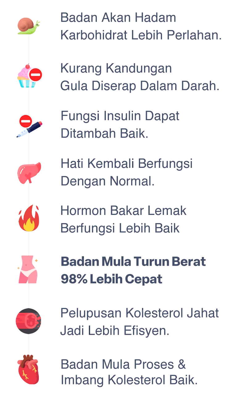 BIOKENAF® target baiki proses metabolisma badan dengan merawat pencernaan karbohidrat, perlahankan serapan gula ke dalam darah jadikan fungsi insulin & hati lebih baik, mengakibatkan hormon pembakar lemak aktif secara berterusan. Hasilnya, usaha untuk anda buang lemak & turun berat jadi lebih mudah, cepat dan kekal.